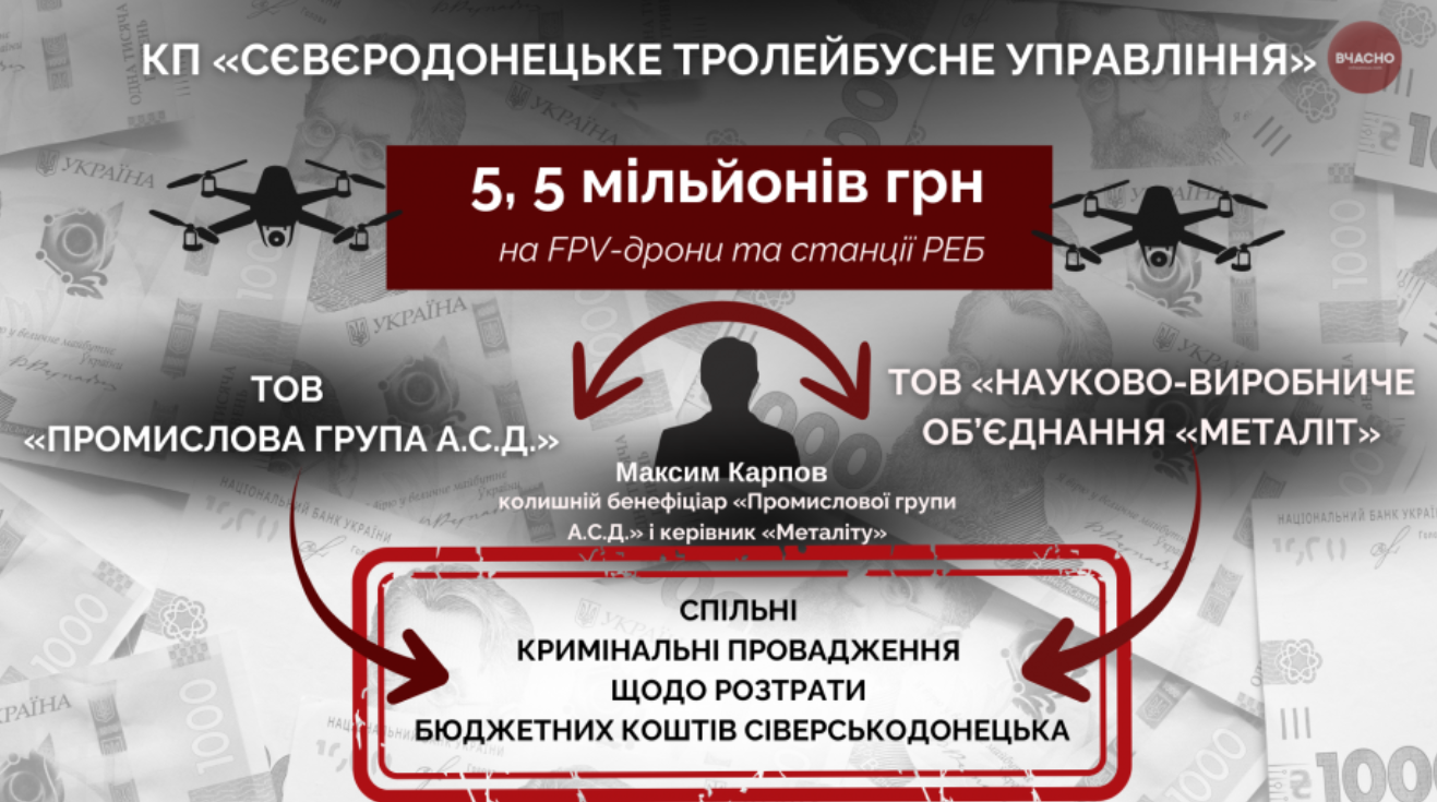Гроші пройшли через КП «Сєвєродонецьке тролейбусне управління» по Програмі шефської допомоги військовим, яка дозволяє купувати оборонне обладнання без тендерів. Комунальники уклали дві угоди на постачання 150 FPV-дронів і три наземні станції управління (2,57 млн грн) та 20 станцій РЕБ (2,96 млн грн).