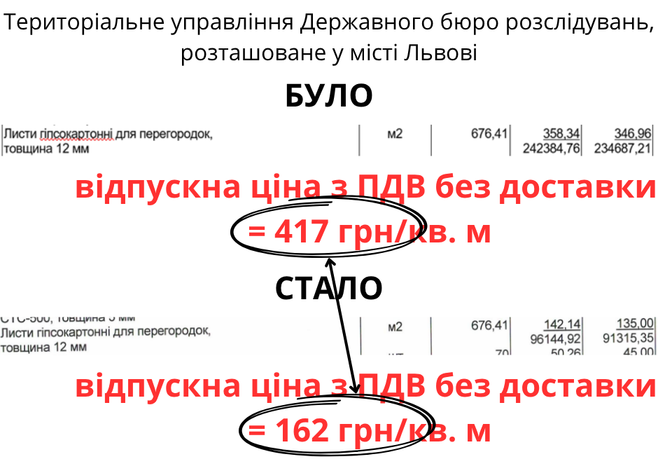 Спочатку у договорі гіпсокартон для перегородок 12 мм замовляли по 417 грн/кв. м, а потім додатковою угодою зменшили ціну в 2,5 раза до 162 грн/кв. м. База «Куб» продає стіновий гіпсокартон Knauf 12,5 мм по 104 грн/кв. м, а «Перший дім» у Тернополі пропонує стіновий гіпсокартон VistaGips 12,5 мм по 115 грн/кв. м.