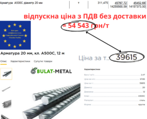 Арматура А500С діаметром 20 мм коштує 54 543 грн/т. Але компанія «Iron World» продає її по 32 435 грн/т, що на 41% дешевше, «Булат-Метал» – по 39 615 грн/т, що на 27% дешевше.