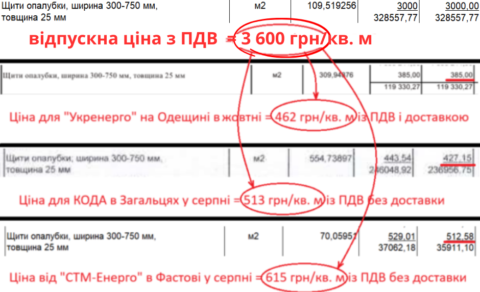 Щити опалубки шириною 300-750 мм товщиною 25 мм врахували по 3 600 грн/кв. м. Це значно дорожче за інші тендери. Наприклад, у кошторисі «Укренерго» на Одещині така опалубка була врахована по 462 грн/кв. м із ПДВ та доставкою. Це майже в вісім разів дешевше. Київська ОДА замовила будівництво укриття для школи в селі Загальці біля Бородянки з такою опалубкою по 513 грн/кв. м, що у сім разів дешевше. А Фастівська міськрада замовляла таку опалубку для лікарні по 615 грн/кв. м, що ушестеро дешевше.
