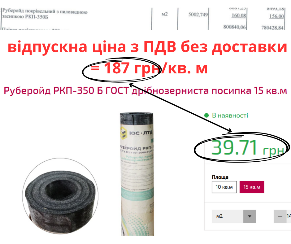 У інформації про ціни на матеріальні ресурси покрівельний руберойд РКП-350Б врахували по 187 грн/кв. м (тут і далі ціни з ПДВ). Компанія «OVI» продає такий руберойд по 18 грн/кв. м, що вдесятеро дешевше. База «Куб» пропонує його по 24 грн/кв. м, а «Торгово-будівельна компанія Маяк» – по 40 грн/кв. м. Це в 5-8 разів дешевше.
