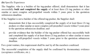 Згідно кваліфікаційних вимог тендерної документації, учасник, який сам був виробником, мав підтвердити досвід будівництва і постачання мінімум трьох буксирів-штовхачів або інших подібних чи складніших самохідних суден протягом п’яти років до кінцевого строку подання цінової пропозиції. Учасник, який не був виробником, мав підтвердити згаданий досвід постачання для себе ТА згаданий досвід будівництва і постачання для виробника.